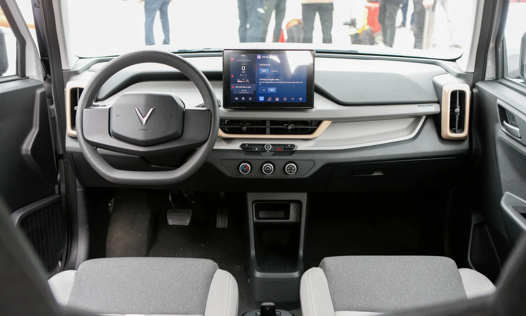 Khoang nội thất VinFast VF 3 được phát triển theo triết lý tối giản song hiện đại và có phần cá tính với các chi tiết hình học như cửa gió điều hòa hai bên bảng táp-lô, vô-lăng D-cut 2 chấu... Điểm nhấn bên trong khoang lái VF 3 là màn hình trung tâm 10 inch, nơi thực hiện thao tác các tính năng trên xe.