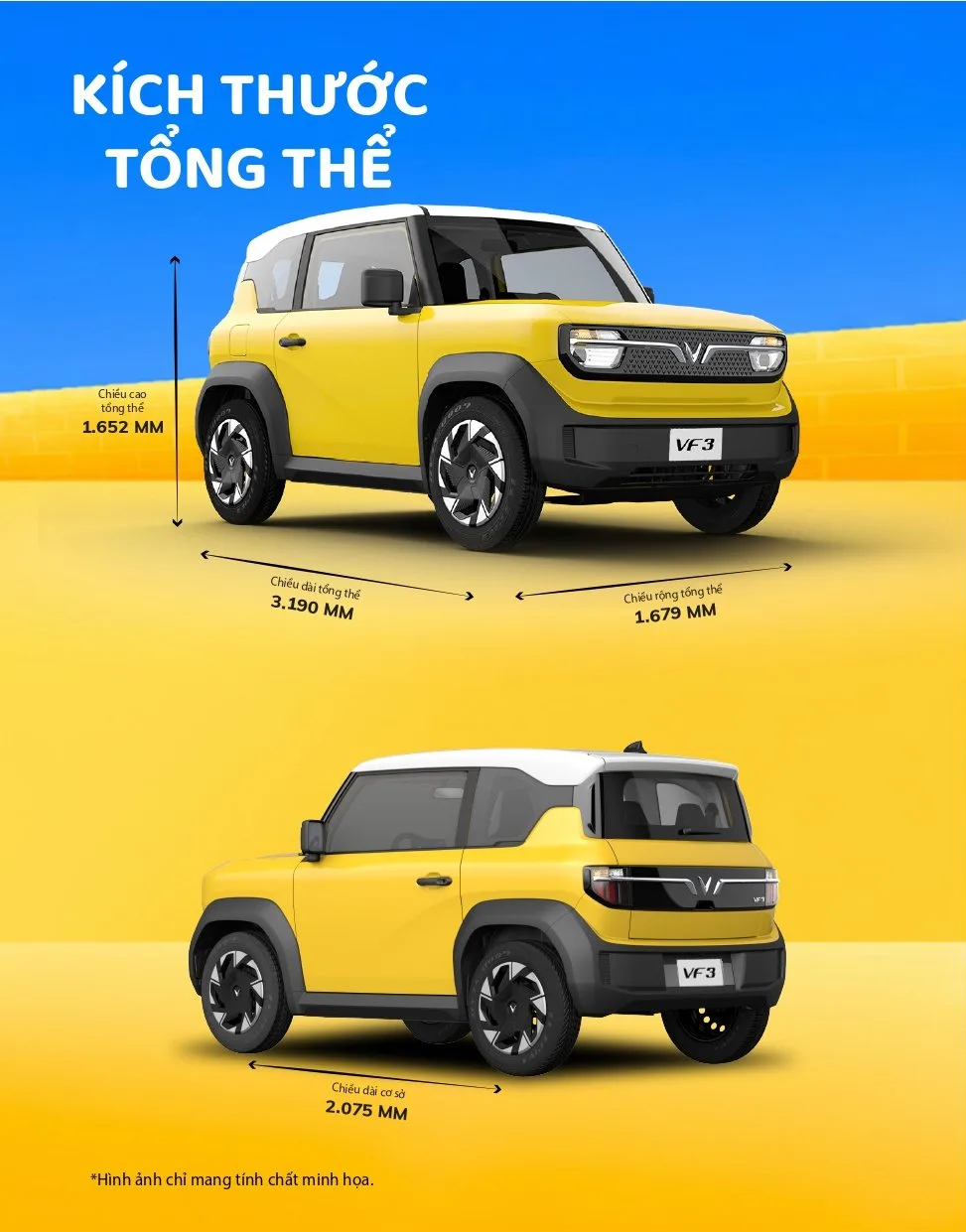 VinFast VF 3 là sản phẩm được xây dựng nhằm hướng tới tệp khách hàng mua ô tô lần đầu hoặc người dùng có nhu cầu về một mẫu xe nhỏ gọn để di chuyển trên các tuyến phố chật hẹp. Do đó, xe sở hữu ngoại hình rất nhỏ gọn với các số đo chiều dài x rộng x cao của xe lần lượt là 3.190 x 1.679 x 1.622 mm, trục cơ sở 2.075 mm.
