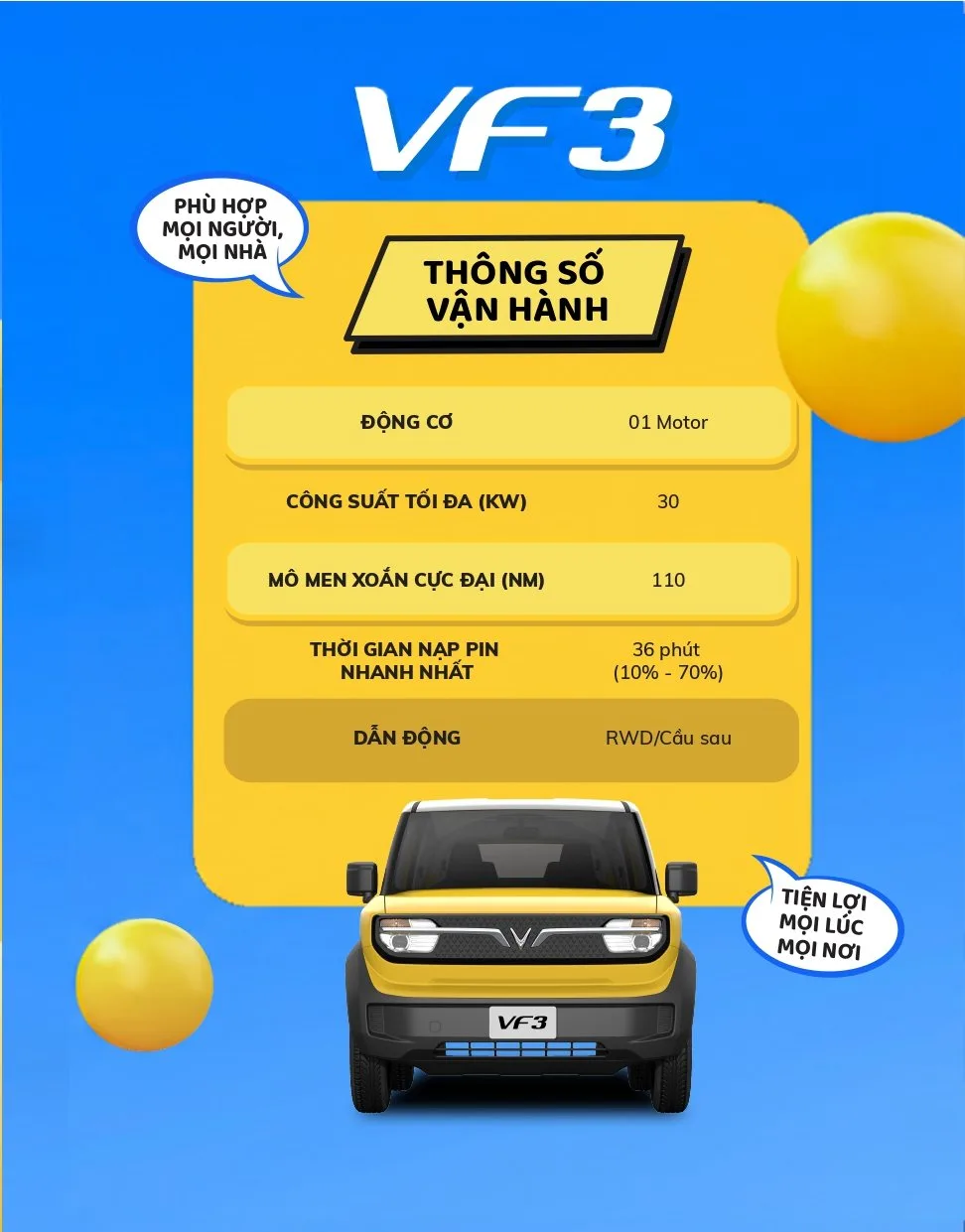 VinFast VF3 lắp đặt một mô-tơ điện ở cầu sau, cho công suất tối đa 32 kW (khoảng 43 mã lực) và mô-men xoắn cực đại 110 Nm. Sức mạnh này cho phép xe tăng tốc từ 0-50 km/h trong 5,3 giây.