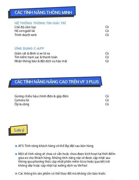Dù sở hữu mức giá rẻ nhưng VF3 cũng có những tính năng thông minh như đồng bộ/quản lý tài khoản, chế độ Cắm trại, tìm kiếm địa điểm/dẫn đường, định vị xe từ xa, đồng bộ lịch/danh bạ điện thoại, cập nhật phần mềm miễn phí/thu phí, nhận thông báo/đặt dịch vụ hậu mãi, quản lý gói cước thuê pin trực tuyến, tra cứu/truy cập Internet,...