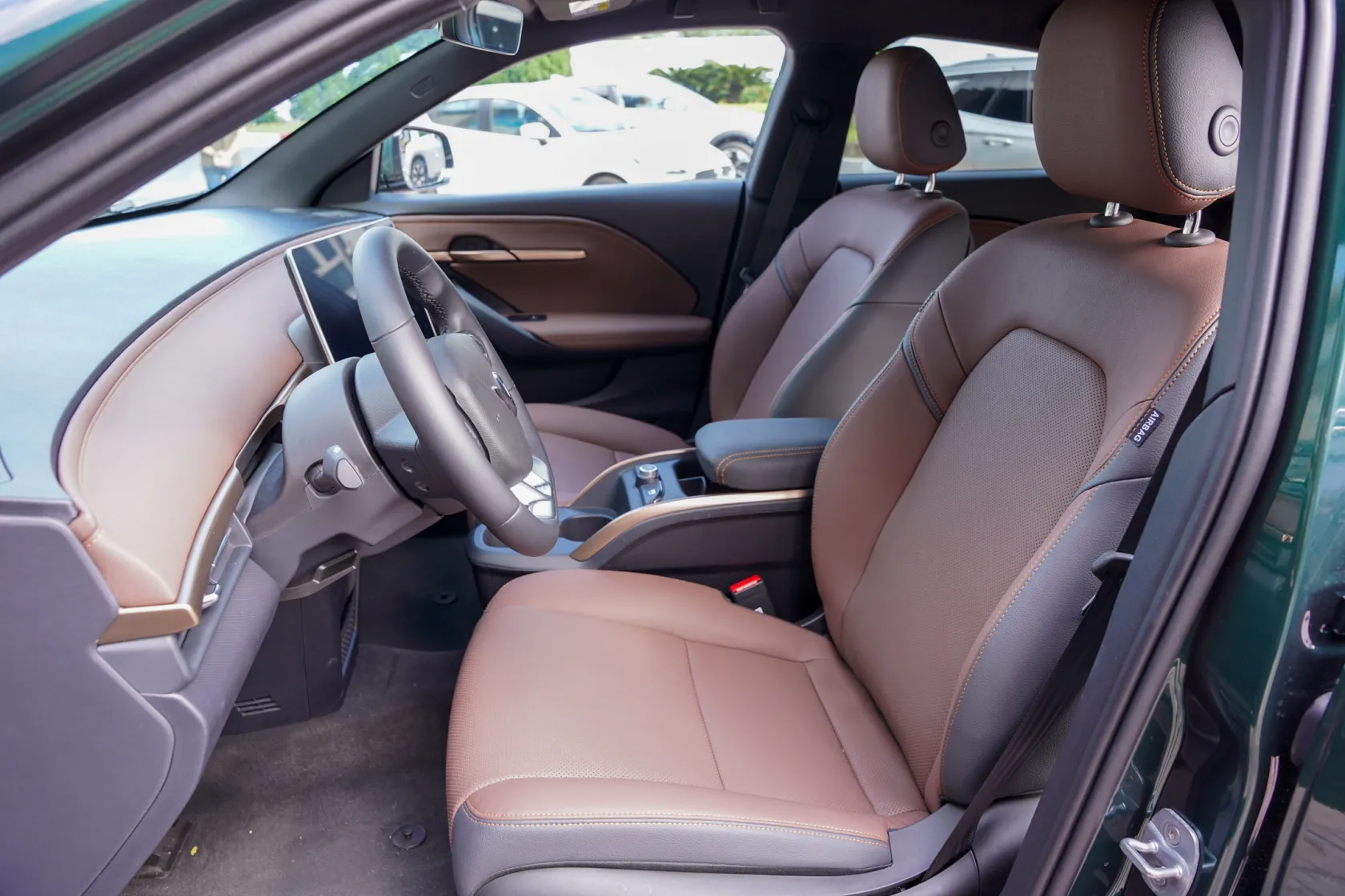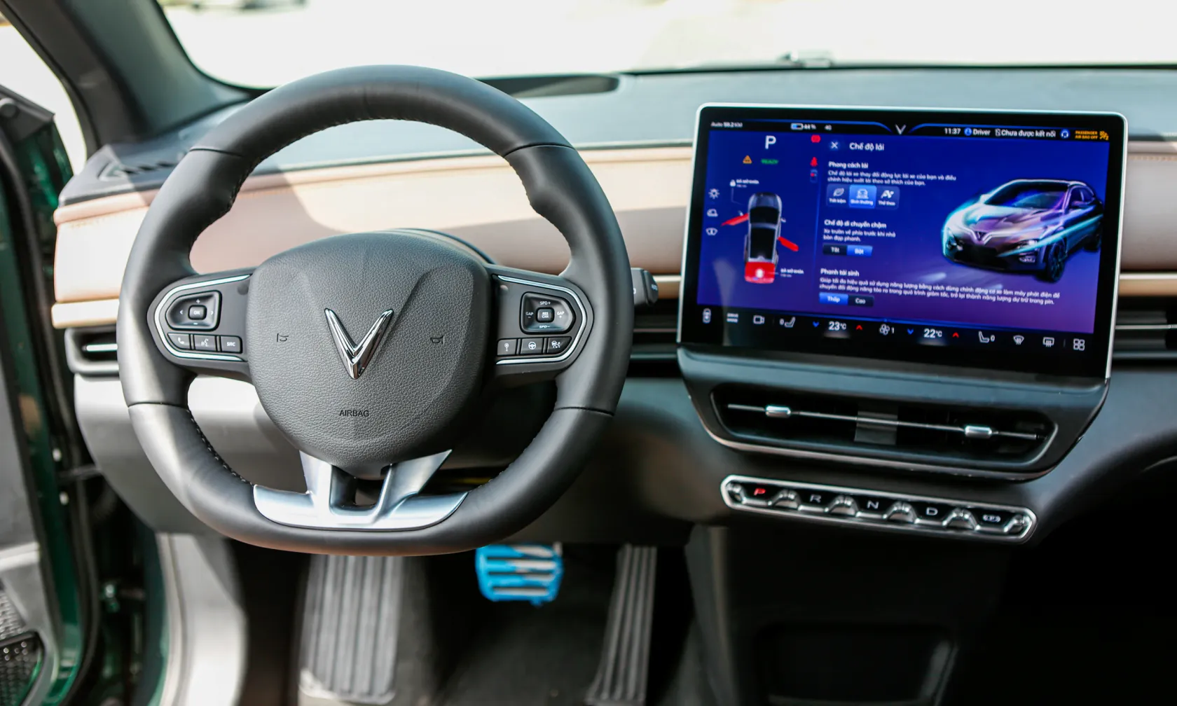 Vô-lăng 3 chấu thiết kế dạng D-cut thể thao, được nhấn nhá bởi các chi tiết mạ bạc, mang đến cảm giác sang trọng cho mẫu SUV điện phổ thông. Trên tay lái tích hợp các nút bấm chức năng tiện lợi.
