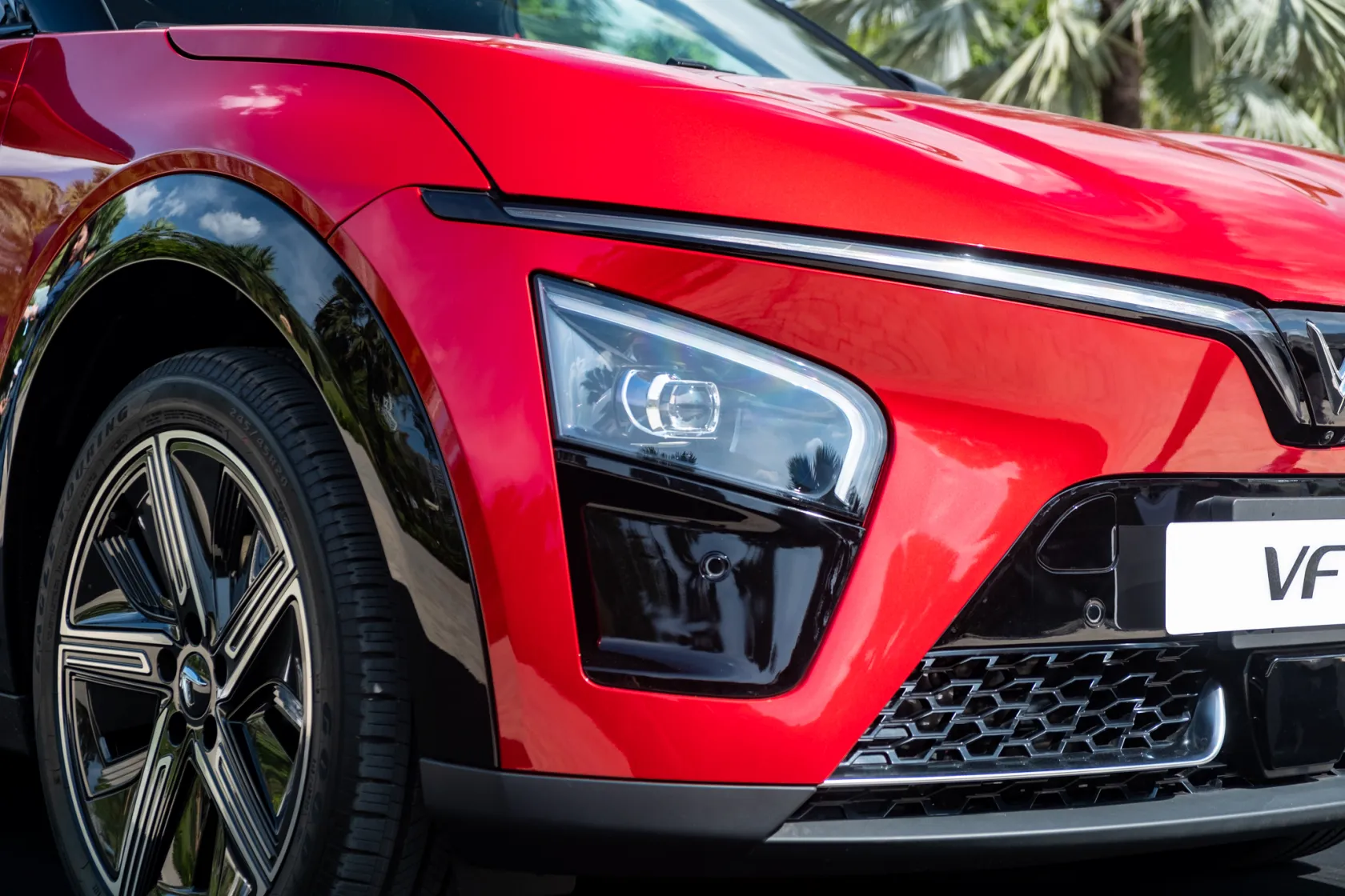 Phía dưới, bố trí cụm đèn pha LED projector kích thước lớn, nằm trọn trong khối hình thang góc cạnh. Sự xuất hiện của những đường gân dập nổi lớn trên nắp ca-pô, nhấn mạnh vẻ đẹp cơ bắp, khỏe khoắn, đậm chất SUV của VF7.