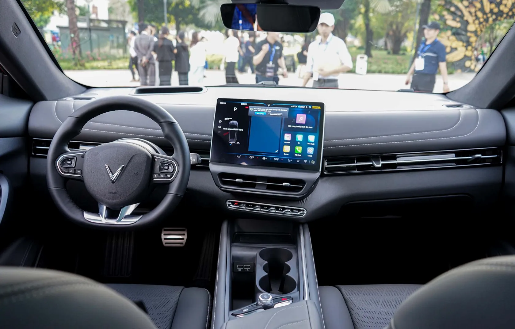 Vô-lăng xe thiết kế D-cut thể thao giống như những người anh em cùng nhà, song mang đến cái nhìn sang trọng hơn hẳn nhờ lối phối màu độc đáo. Đồng hồ hiển thị thông tin lái tiếp tục không có mặt trên mẫu SUV điện cỡ C của VinFast.